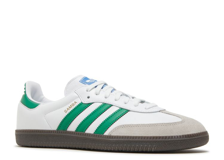 The Adidas Samba White Green is a timeless sneaker featuring a clean white leather upper with vibrant green accents on the signature three stripes and heel tab. The classic Samba silhouette is enhanced with a suede toe cap for added texture and durability, while the gum rubber outsole provides grip and a vintage feel. With its blend of retro design and fresh color contrast, the Adidas Samba White Green is perfect for both casual and sporty looks, offering a versatile and stylish footwear option.