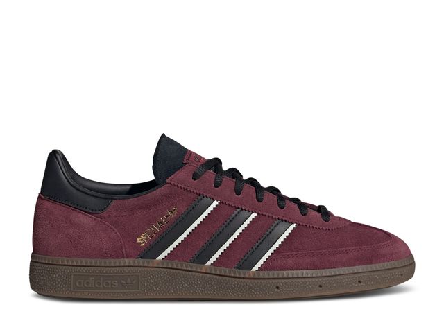 The Adidas Handball Spezial Maroon Black is a stylish and versatile sneaker. This model features a rich maroon suede upper with contrasting black stripes and heel tab. The iconic Adidas trefoil logo is subtly placed on the tongue and heel. Designed for both performance and casual wear, the shoe offers a gum rubber outsole for optimal grip and comfort. The overall design balances a retro athletic look with modern streetwear appeal, making it a popular choice for sneaker enthusiasts and fashion-conscious individuals alike.