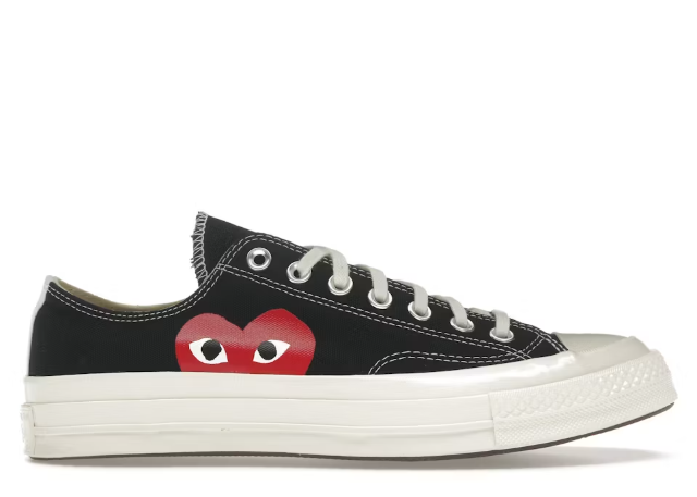 The Comme des Garçons PLAY x Converse Chuck Taylor (Black) features a classic black canvas upper with the iconic red heart logo. Available in high-top or low-top, they blend minimalist style with streetwear flair. Runs about half a size large.
