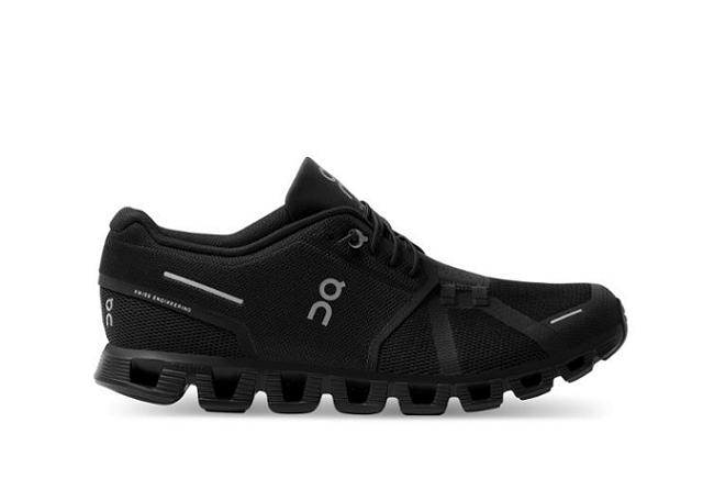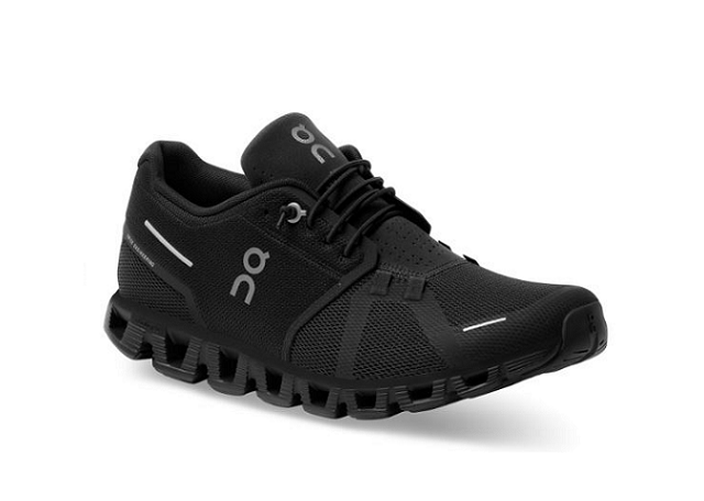 The On Running Cloud 5 All Black is a type of running shoe made by the Swiss brand On Running. It is designed to provide a comfortable and responsive running experience, with a focus on cushioning and support. The Cloud 5 All Black features the brand's signature CloudTec technology, which consists of a series of individual pods on the sole of the shoe that compress and adapt to the runner's stride, providing a smooth and stable ride. The upper is made of a breathable and flexible mesh material, while the lacing system allows for a customizable and secure fit.