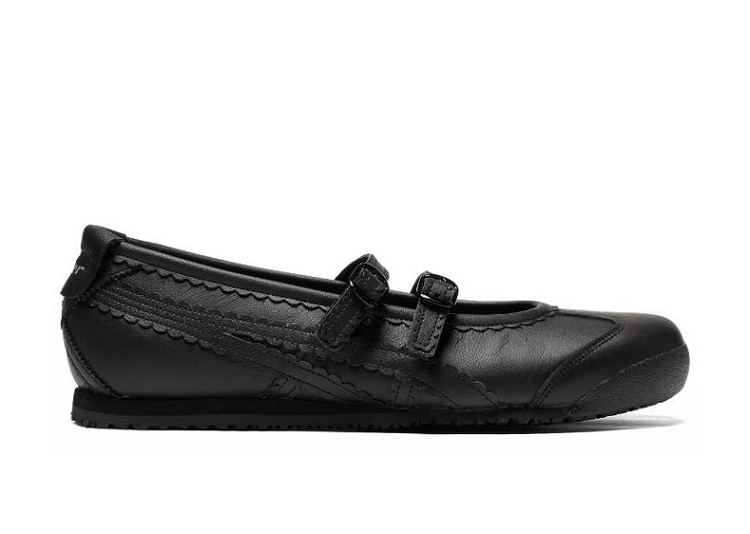 The Onitsuka Tiger Ballet Black slip-on style with straps that features a slim, elegant silhouette and flower-cut Onitsuka Tiger Stripes. Based on the MEXICO 66, it offers the sophistication of a pump while providing a soft feel and comfortable fit for the foot.