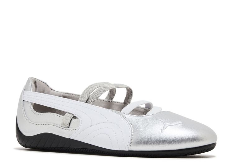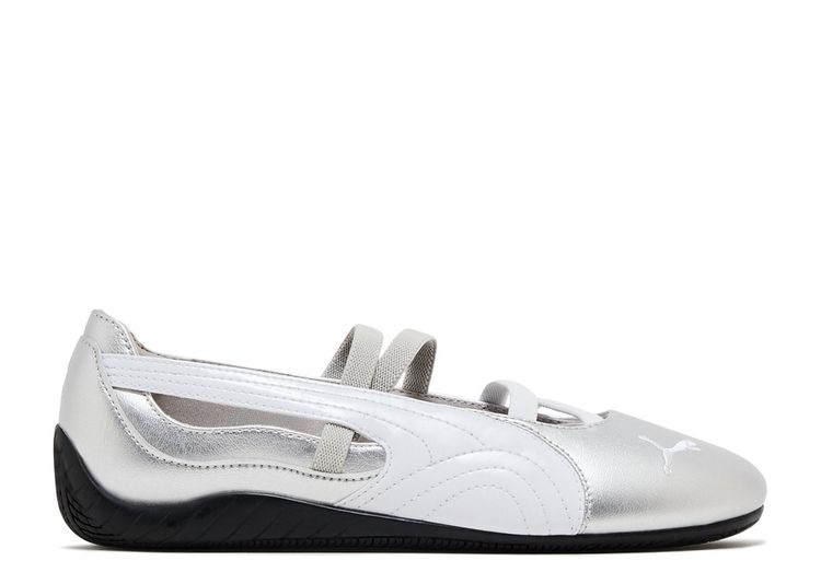 The PUMA Speedcat Ballet Silver is a sleek, low-profile sneaker inspired by motorsport heritage and ballet flats. It features a metallic silver upper with a streamlined silhouette, elastic strap detailing, and the signature embroidered PUMA Cat logo. Lightweight and feminine, it blends sporty aesthetics with everyday elegance perfect for casual streetwear with a touch of shine.