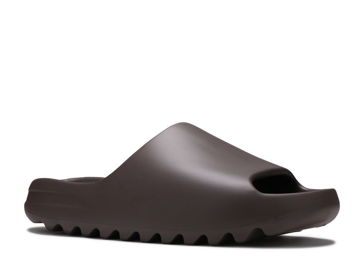 The Yeezy Slide Soot is a minimalist and stylish sandal designed by Kanye West's Yeezy brand. It features a dark brown, almost charcoal-like "Soot" colorway. Made from lightweight, durable EVA foam, the slide offers comfort with a cushioned footbed and a ridged outsole for traction. Its sleek, slip-on design and earthy tone make it versatile for casual wear, combining simplicity with Yeezy's signature modern aesthetic.